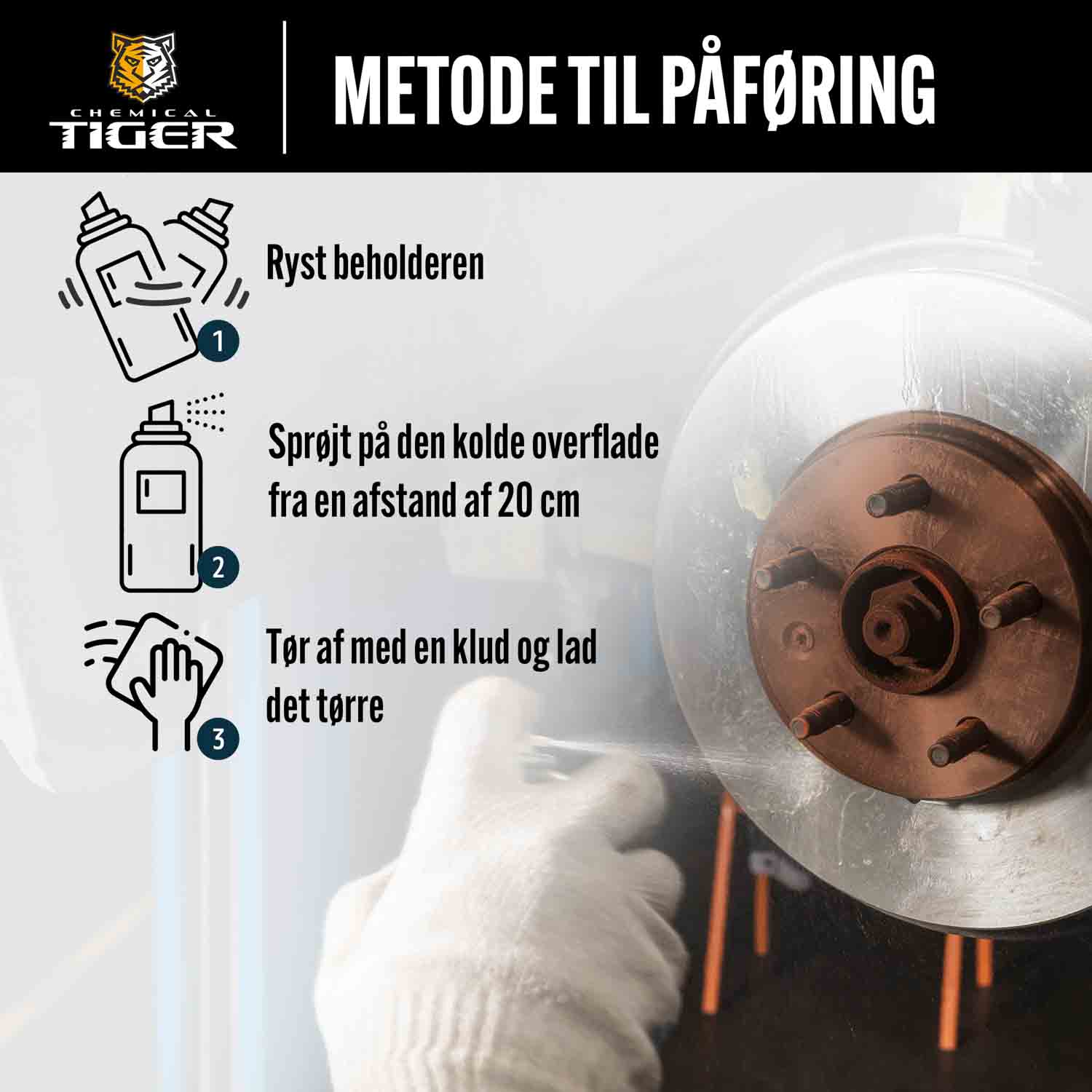 Ryst beholderen før brug. Påfør kun på kolde overflader. Spray på de dele, der skal rengøres, fra en afstand på 10-20 cm. Tør af med en klud, og lad det tørre.