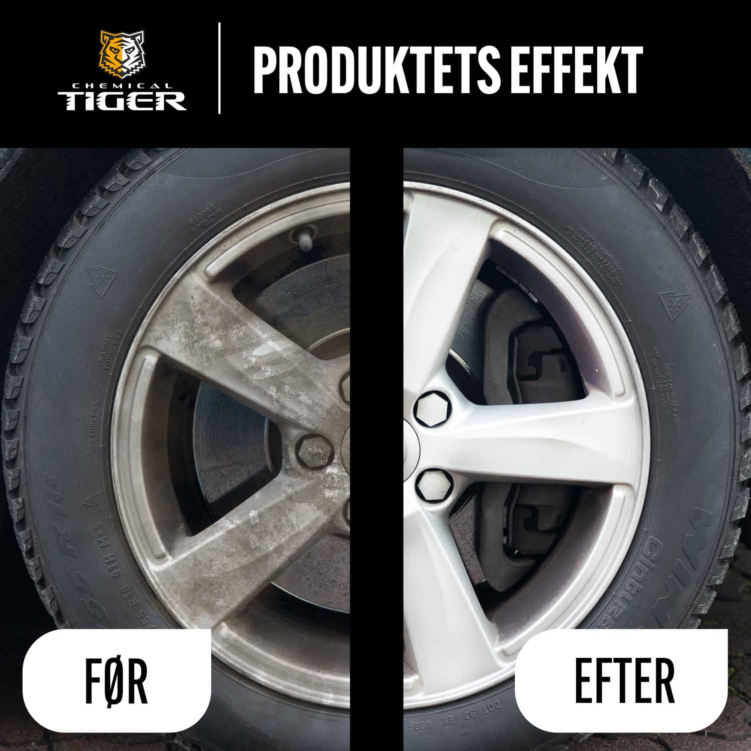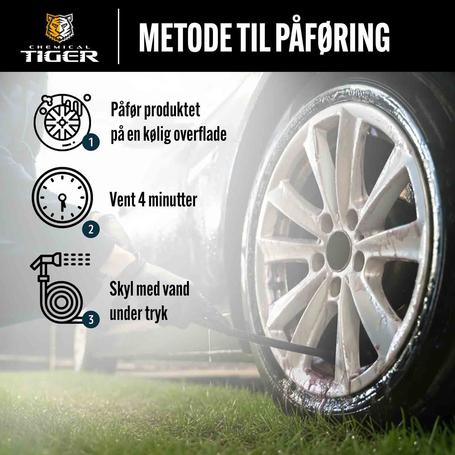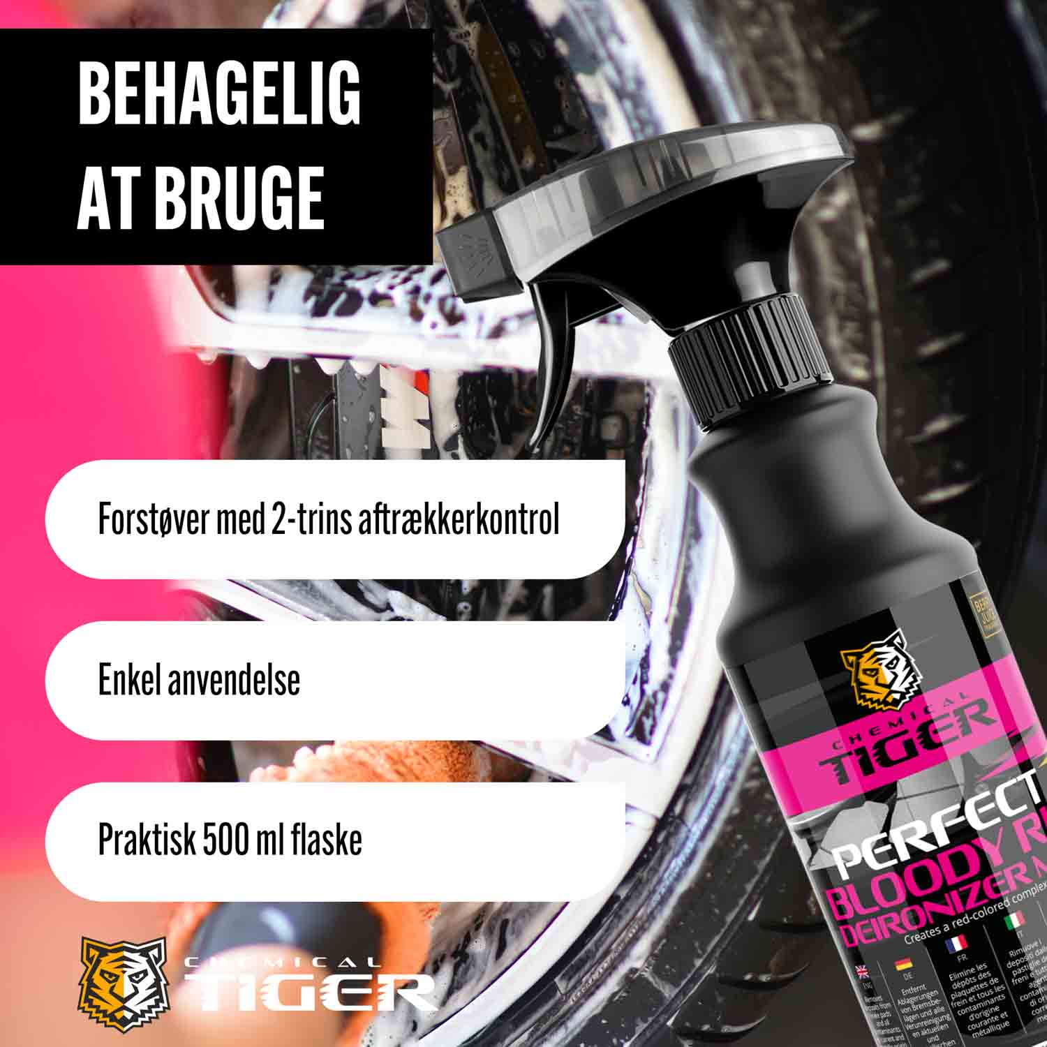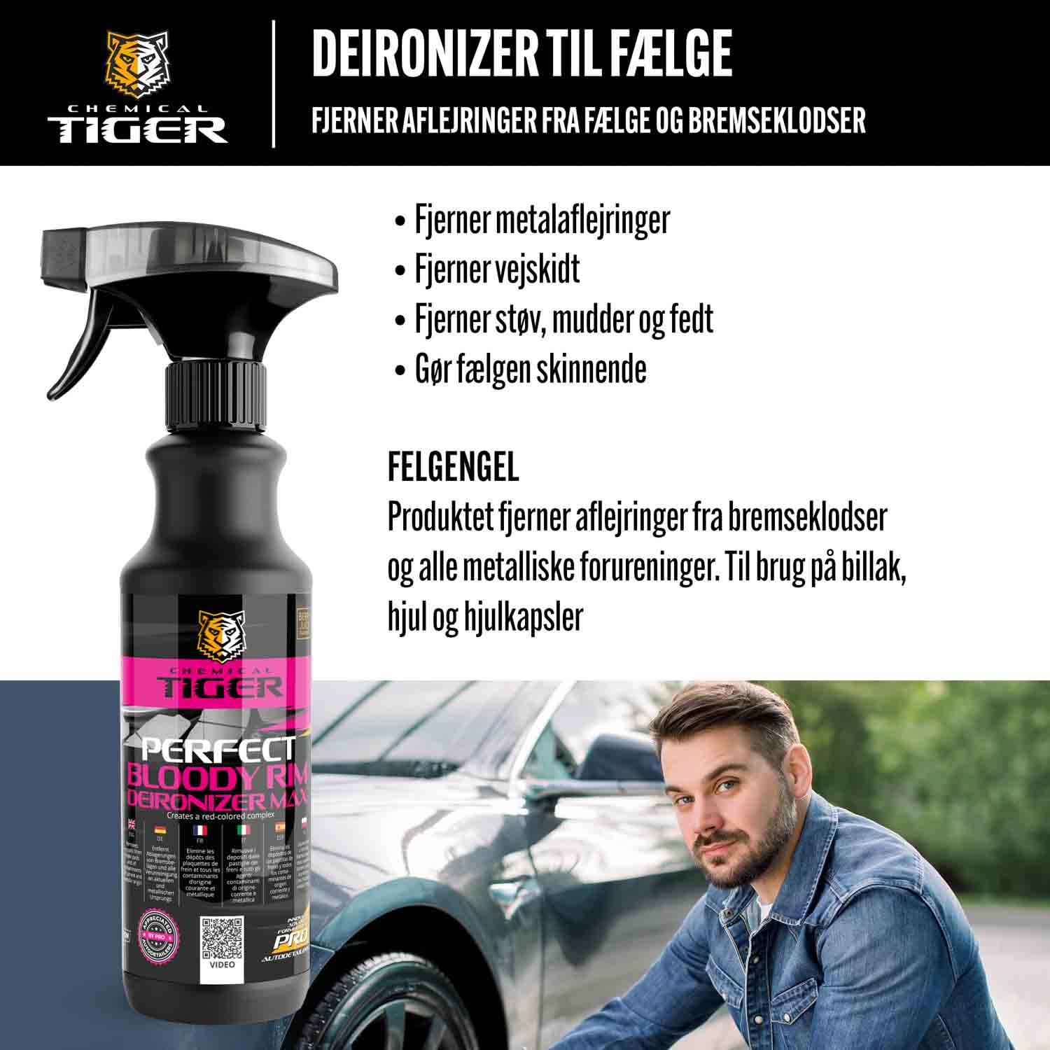 Produktet fjerner aflejringer fra bremseklodser og alle nuværende og metalliske urenheder. Til brug på bilens lak, fælge og hjulkapsler. Produktet indeholder et kompleksdannende middel, som bliver rødt, når det reagerer med metalliske urenheder. Reaktionen gør det således muligt at kontrollere rengøringsprocessen. Ud over kompleksdanneren er produktet beriget med stærke rengøringsmidler, så alle former for nuværende snavs fjernes under brug. Produktets pH-værdi er neutral, hvilket gør det sikkert for alle bilens udvendige overflader. Den ubehagelige lugt af kompleksdanneren, som er karakteristisk for denne type produkt, er blevet domineret af en bærnote.