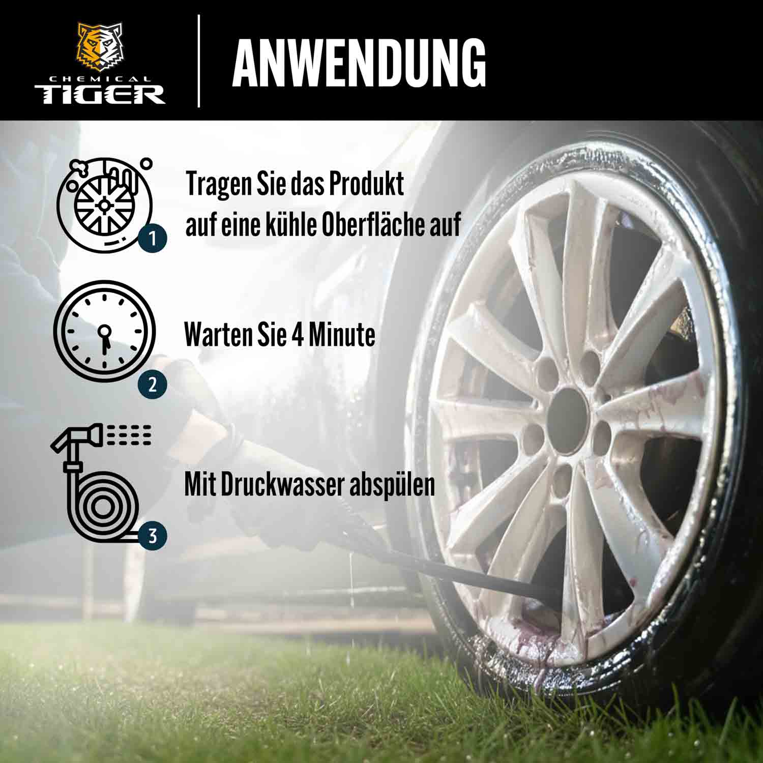 Tragen Sie das Produkt auf die verschmutzte, kühle Oberfläche auf. Warten Sie 2-4 Minuten, dies ist die durchschnittliche Reaktionszeit des Produkts. Gründlich mit Wasser unter Druck abspülen. Bei sehr hartnäckigen Verschmutzungen das Produkt nach dem Auftragen mit einer Bürste, einem Schwamm oder einem Pinsel ausarbeiten. ANWENDUNGSHINWEISE: Das Produkt auf eine kühle Oberfläche auftragen. Das Produkt im Schatten auftragen. Das Produkt nicht gefrieren lassen. Das aufgetragene Produkt nicht austrocknen lassen.