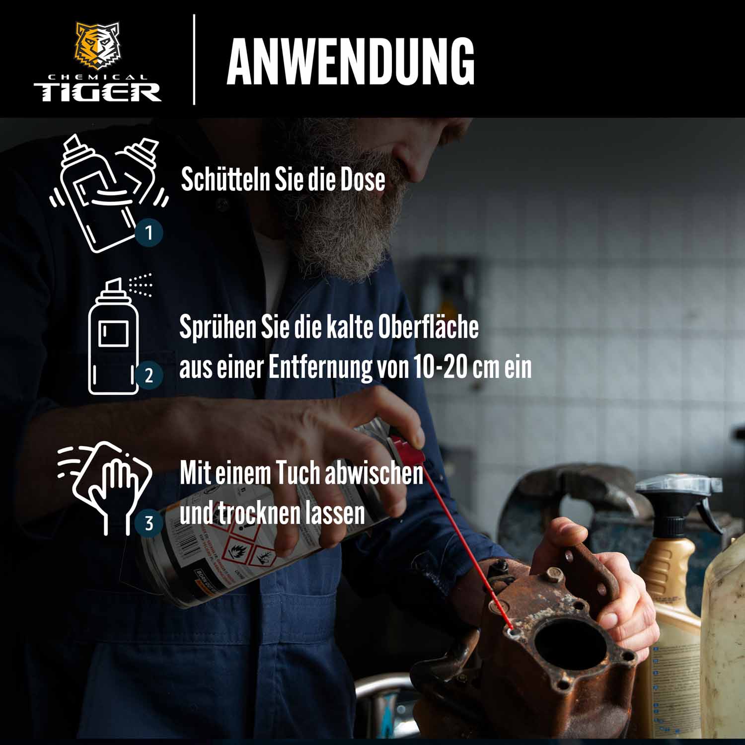 Vor Gebrauch schütteln. Nur auf kalte Oberflächen auftragen. Aus einer Entfernung von 10-20 cm auf die verschmutzten Oberflächen sprühen. Abwischen oder trocknen lassen. Bei empfindlichen Materialien: Gummi, Schaumstoff, Textilien, lackierte Oberflächen, die Wirkung des Produkts an einer unauffälligen Stelle testen.
