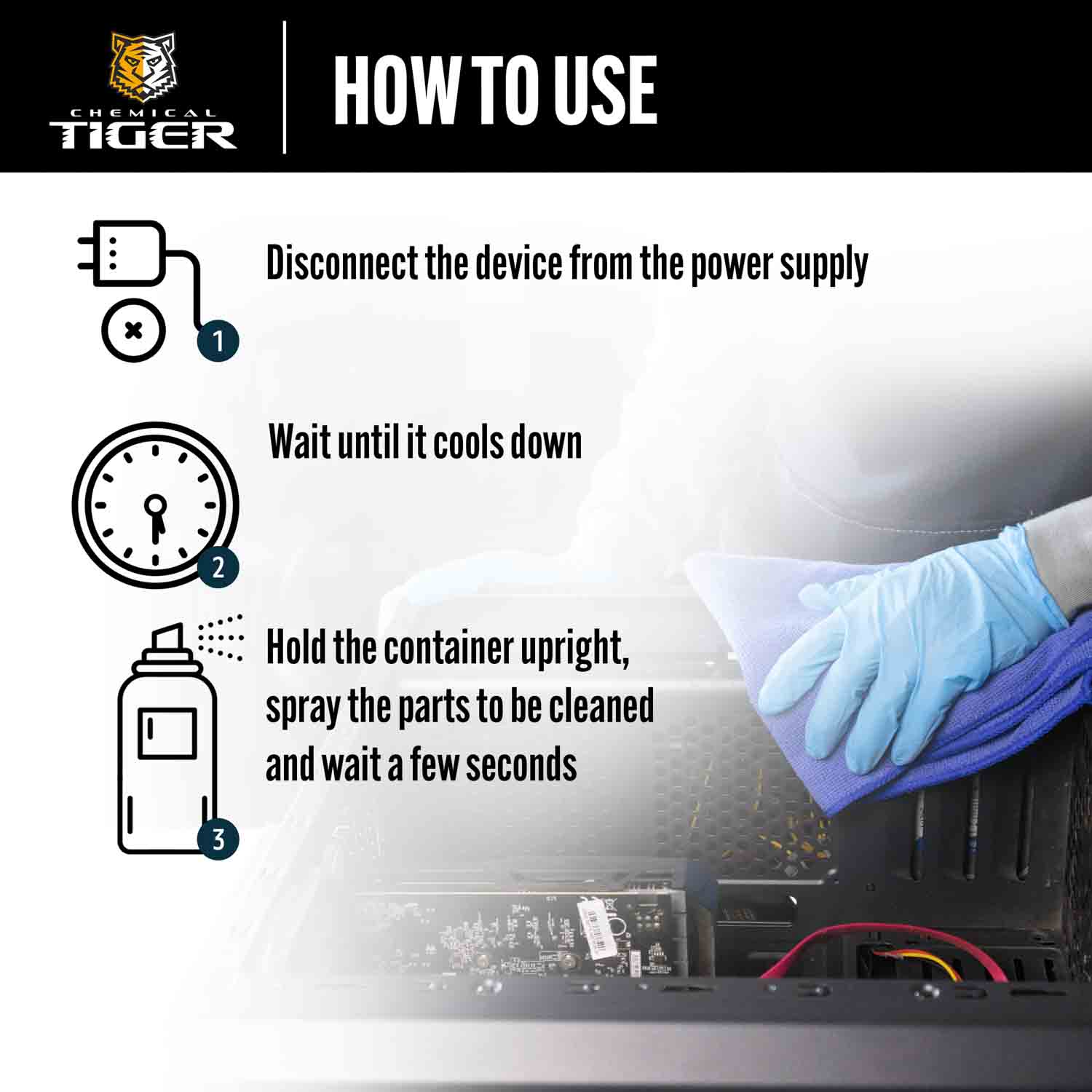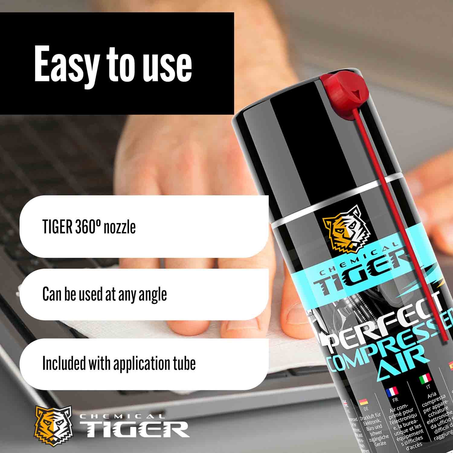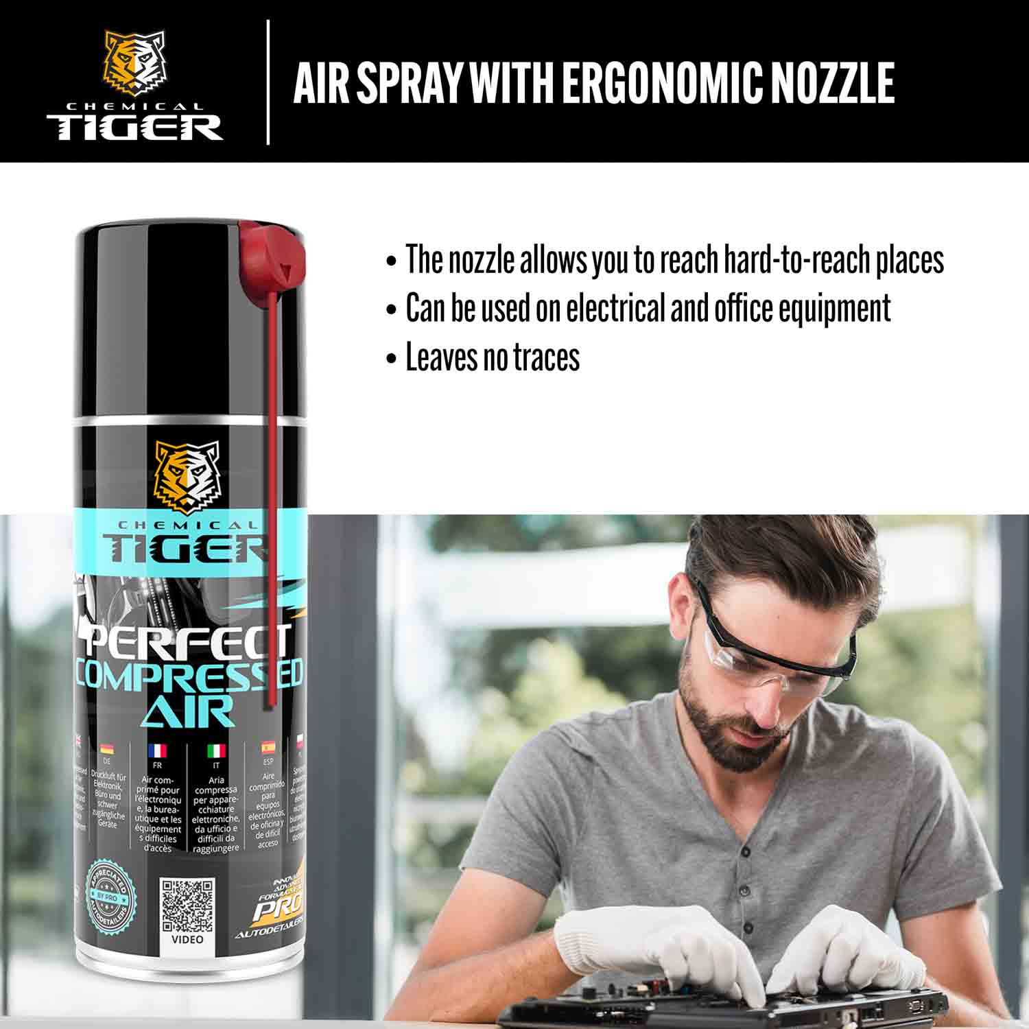 Compressed air for cleaning office equipment and other electrical appliances. Under high pressure, it removes dirt from hard-to-reach areas without leaving any residue.