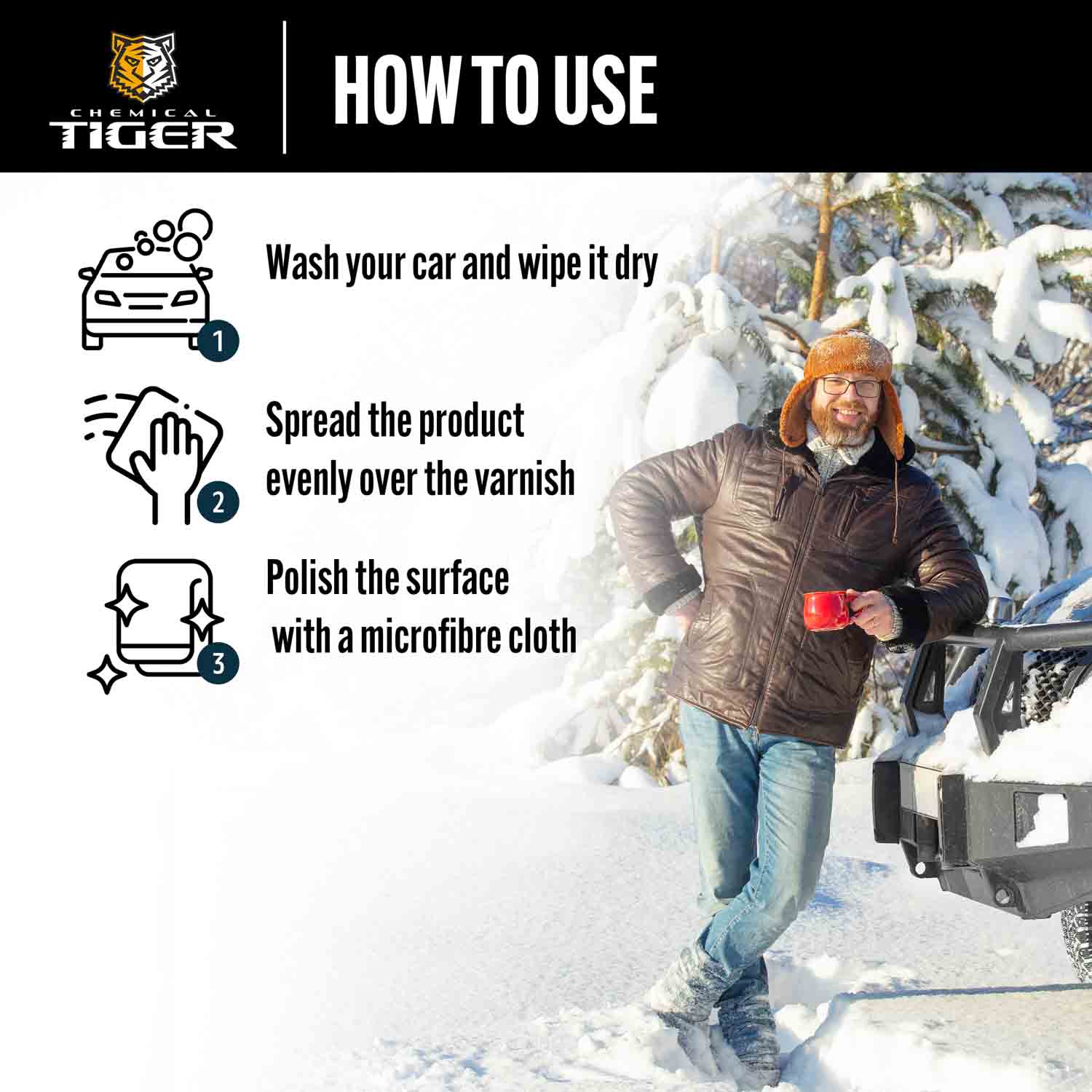 An agent to protect car paint from atmospheric and environmental factors generated primarily in autumn and winter. It protects lacquer from road salt, delays the process of lacquer soiling and creates a slippery hydrophobic shield on its surface. In addition, it guarantees increased gloss of the lacquer. The innovative siloxane preparation instantly binds to the paint surface, so the product is easy to use and the effect is immediate. Working with the product is additionally comfortable due to its pleasant fragrance. The scent is berry and vanilla.