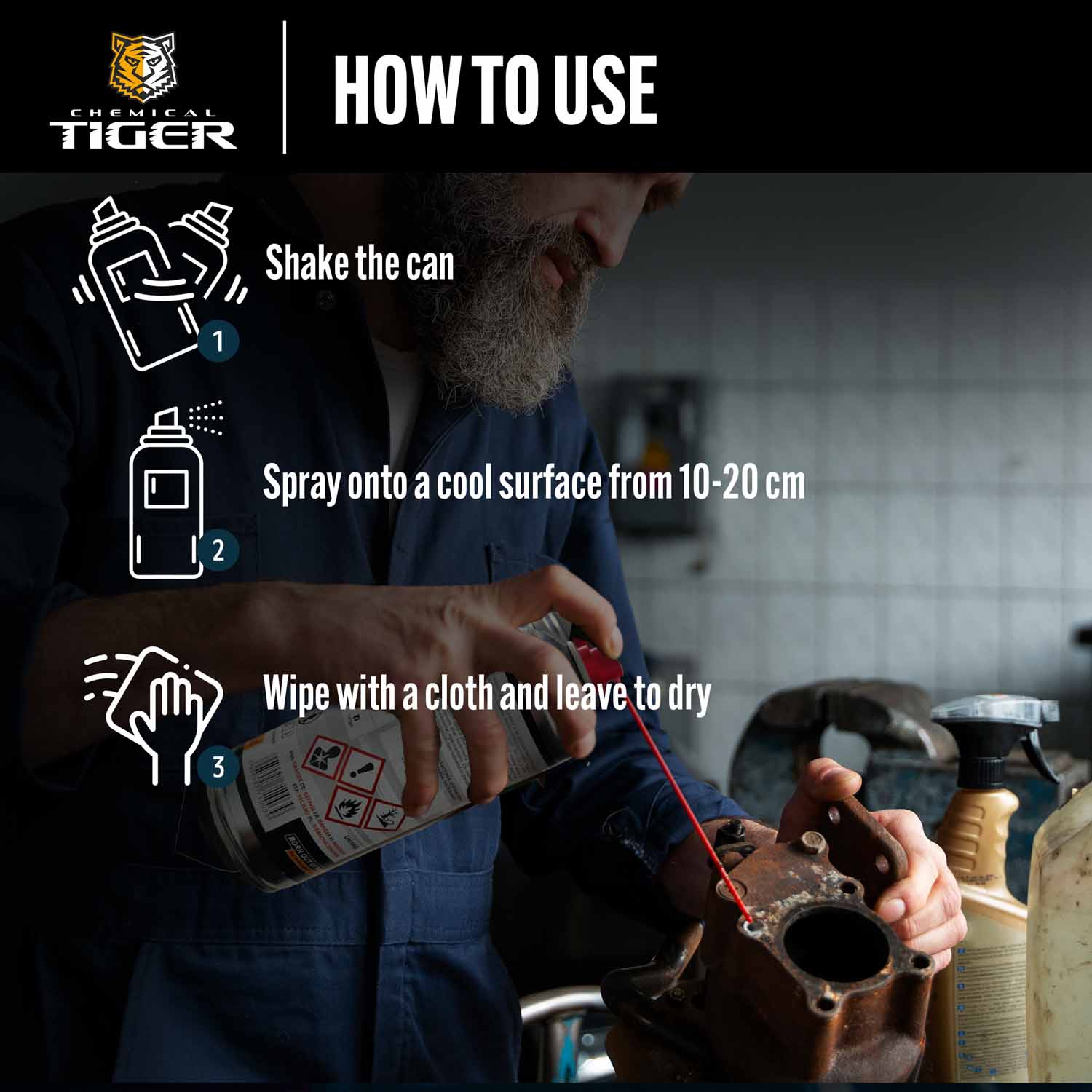 Shake before use. Apply only to cold surfaces. Spray onto soiled surfaces from a distance of 10-20 cm. Wipe off or allow to dry. In the case of sensitive materials: rubber, plastic foam, textiles, varnished surfaces, test the effect of the product in an inconspicuous area.