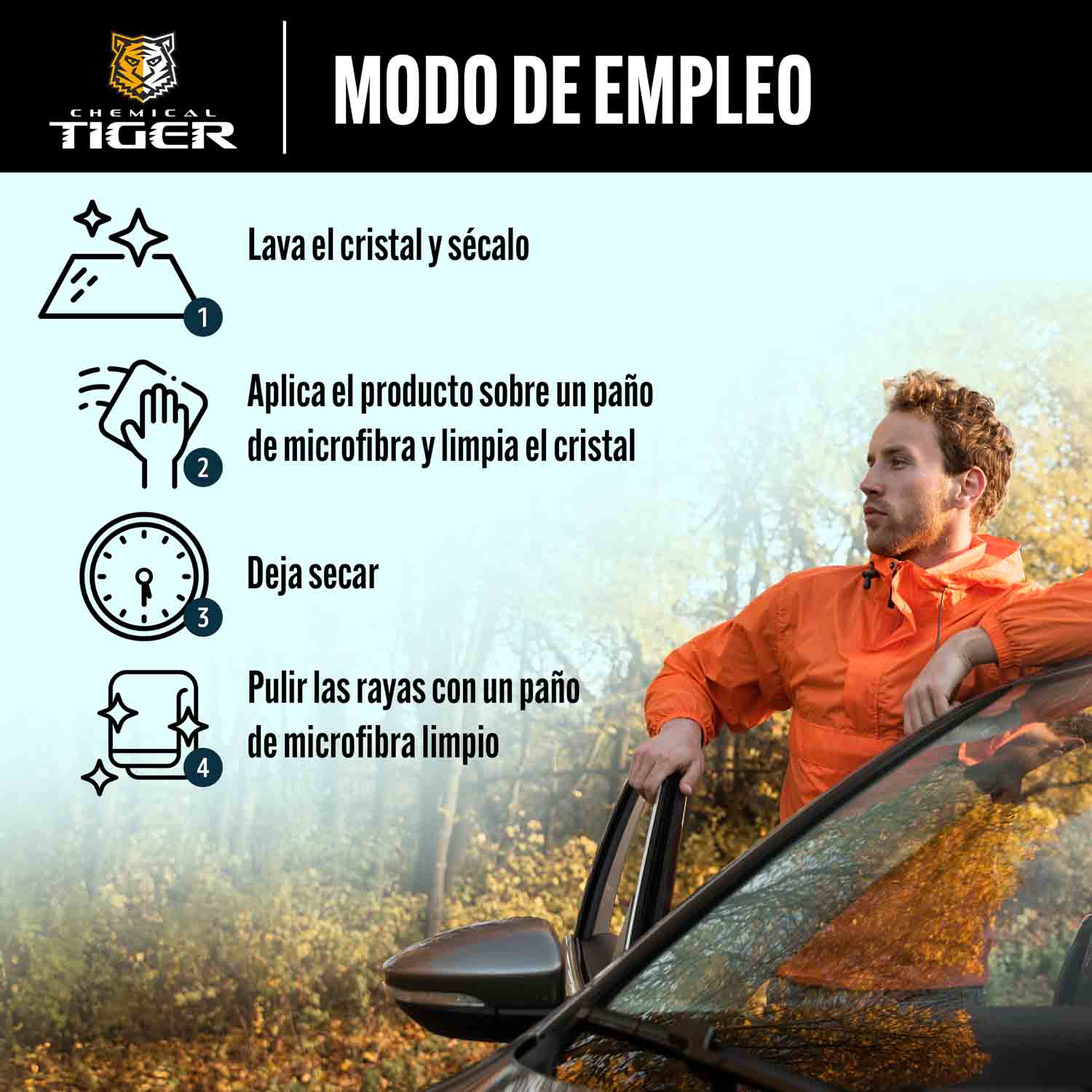 3. limpiar el cristal, dejando una fina película del producto.