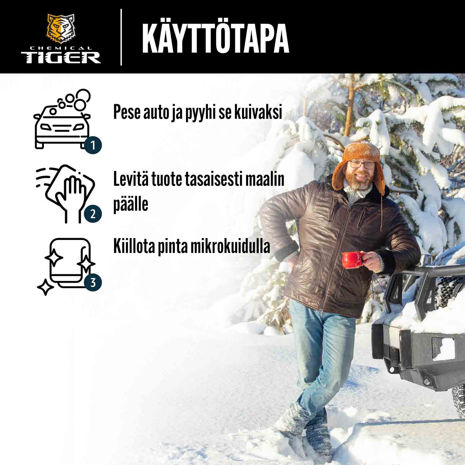 Suojaa auton maalipintaa pääasiassa syksyllä ja talvella syntyviltä ilmakehän ja ympäristön vaikutuksilta. Suojaa maalipintaa tiesuolalta, hidastaa likaantumisprosessia ja luo maalipinnalle liukkaan hydrofobisen suojan. Lisäksi se takaa maalipinnan paremman kiillon. Innovatiivinen siloksaanivalmiste sitoutuu nopeasti maalipintaan, joten tuotetta on helppo käyttää ja vaikutus on välitön. Tuotteen kanssa työskentely on lisäksi miellyttävää sen miellyttävän tuoksun ansiosta. Marjainen-vaniljainen tuoksu.