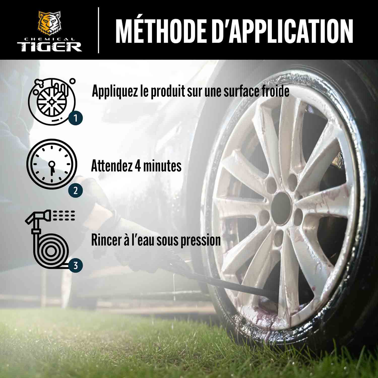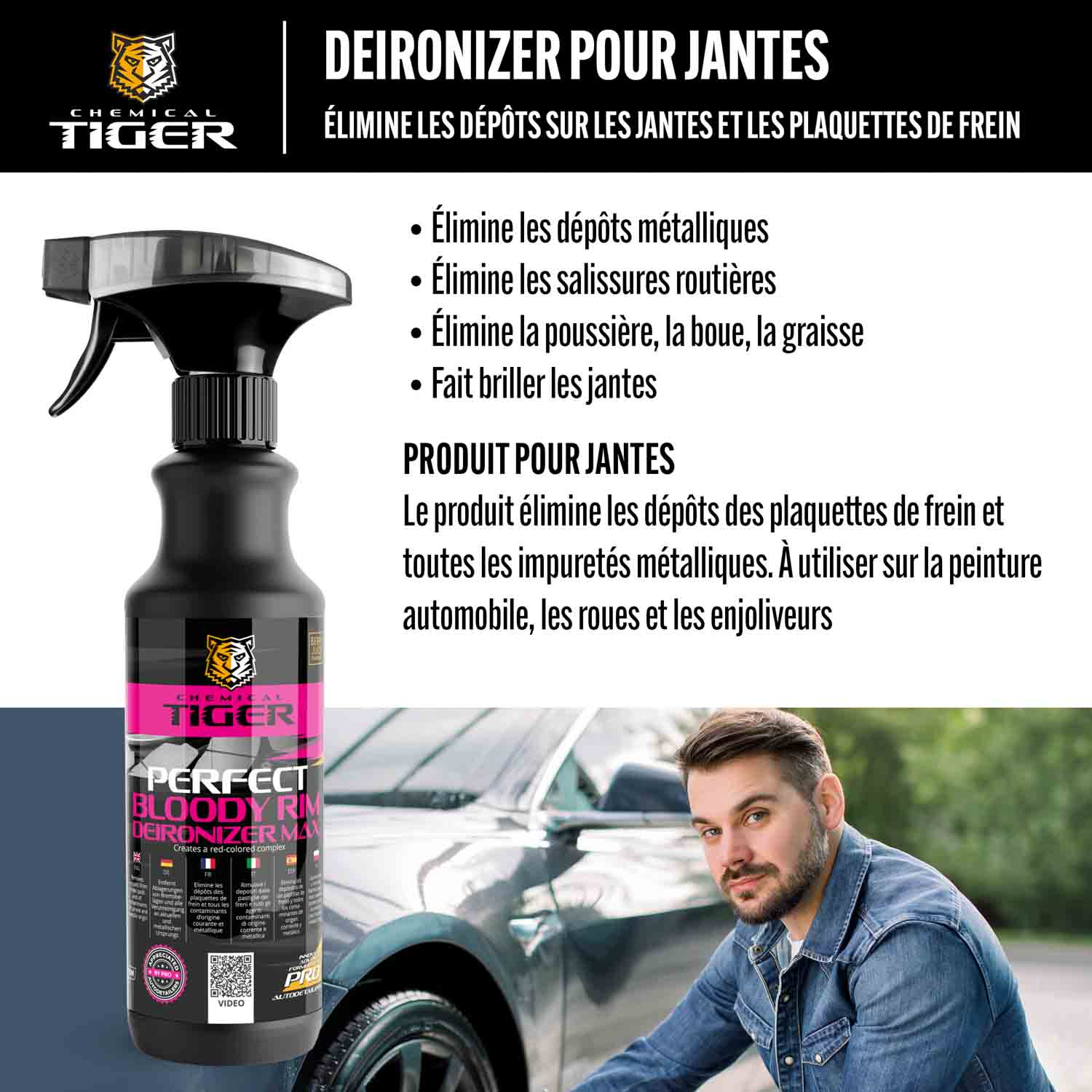 Le produit élimine les dépôts des plaquettes de frein et toutes les impuretés courantes et métalliques. S’utilise sur la peinture des voitures, les roues et les enjoliveurs. Le produit contient un agent complexant qui devient rouge en réagissant avec les impuretés métalliques. La réaction permet ainsi de contrôler le processus de nettoyage. En plus de l’agent complexant, le produit est enrichi de détergents puissants qui permettent d’éliminer toutes les salissures courantes pendant l’utilisation. Le pH du produit est neutre, ce qui le rend sans danger pour toutes les surfaces extérieures de la voiture. L’odeur désagréable de l’agent complexant, caractéristique de ce type de produit, a été dominée par une note de baies.