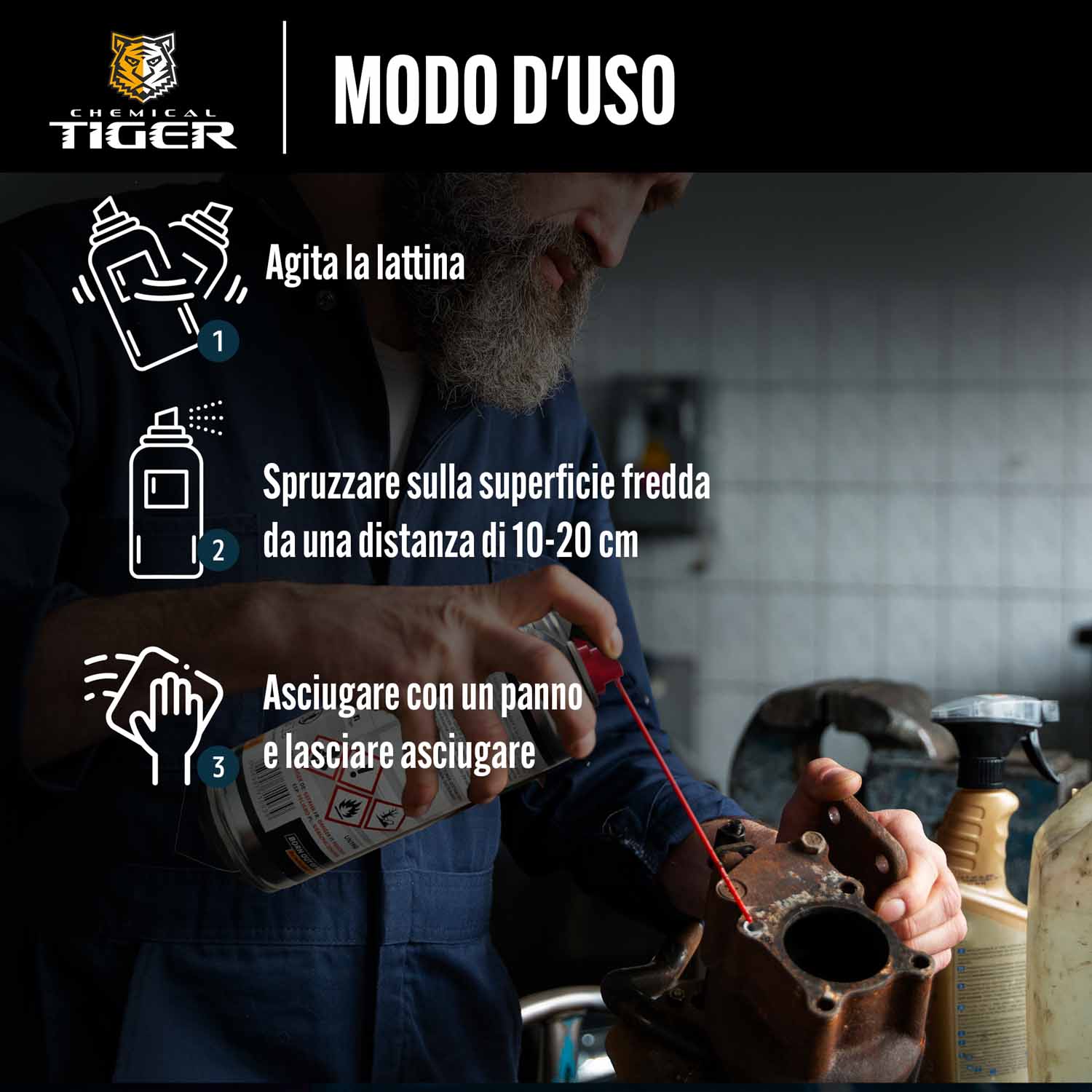 Agitare prima dell'uso. Applicare solo su superfici fredde. Spruzzare sulle superfici sporche da una distanza di 10-20 cm. Asciugare o lasciare asciugare. In caso di materiali sensibili: gomma, plastica espansa, tessuti, superfici verniciate, testare l'effetto del prodotto in un'area non visibile.