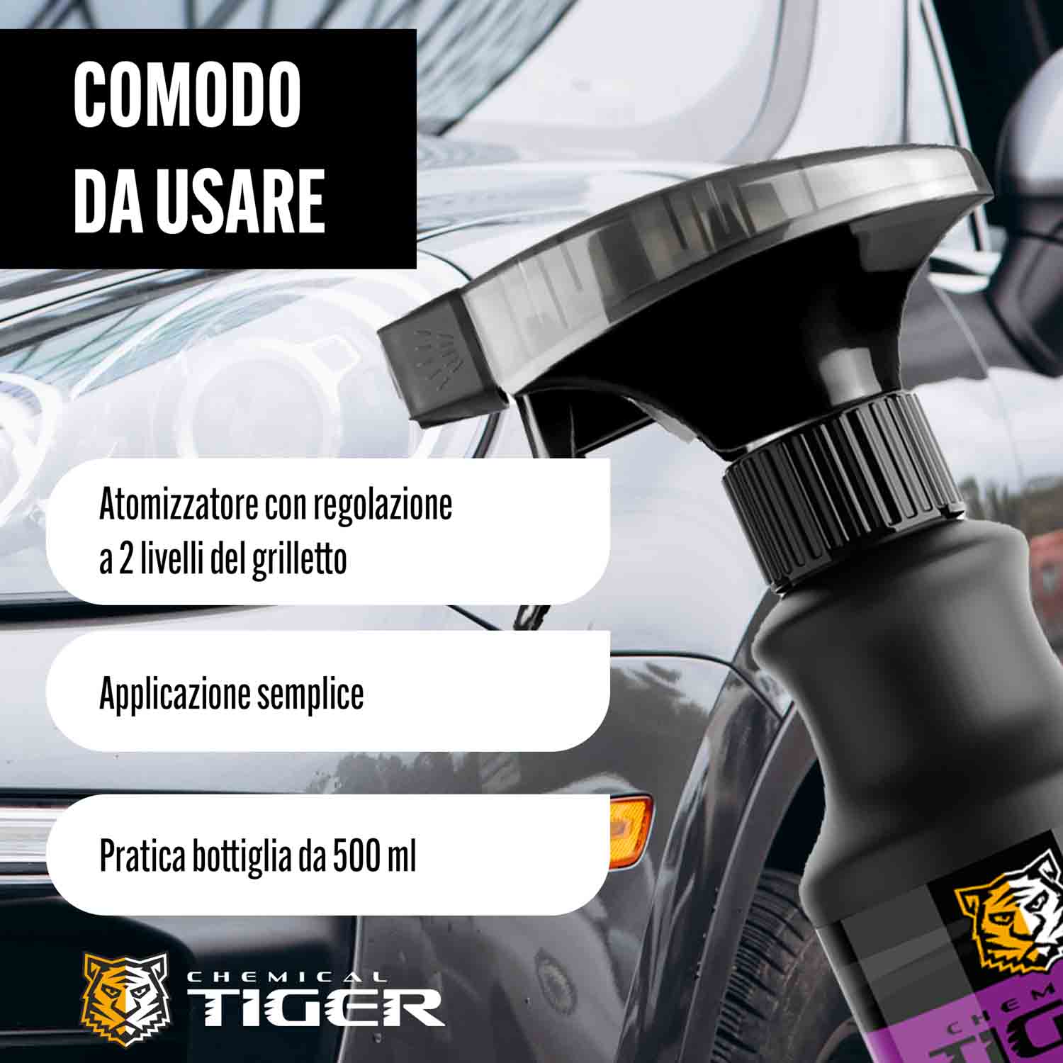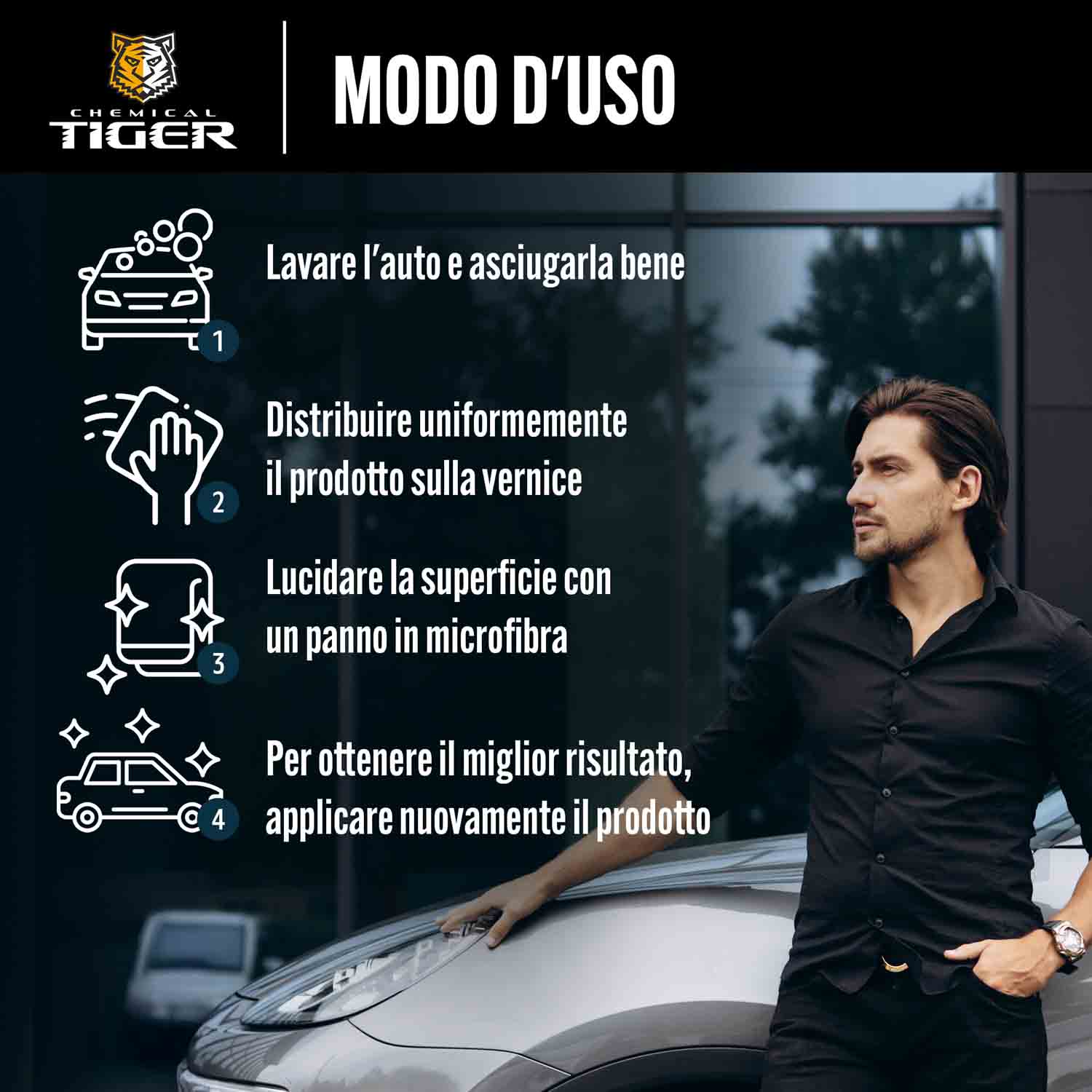 • rende la vernice scivolosa: la superficie diventa liscia e resistente allo sporco, rendendo più facile mantenere l’auto pulita