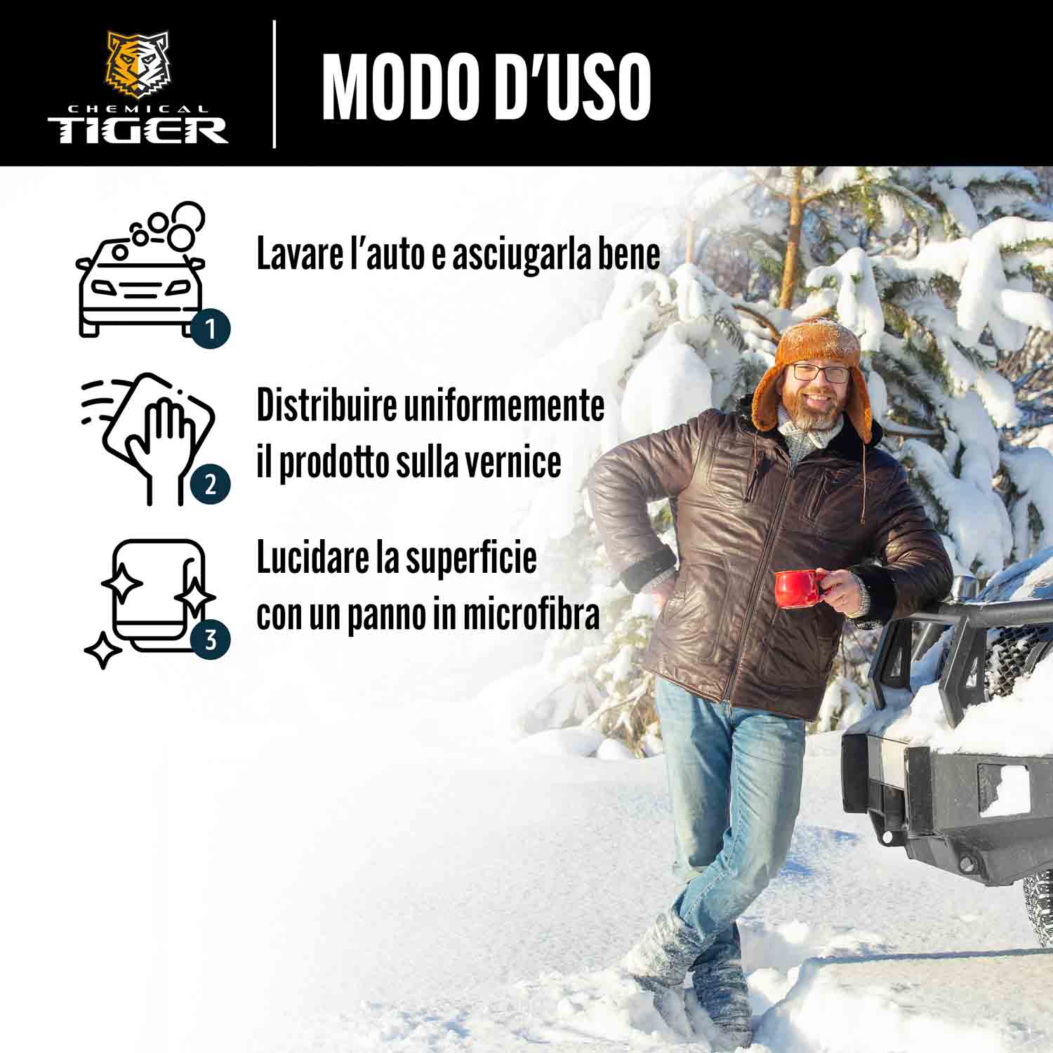 Per utilizzare il prodotto sono necessarie due microfibre asciutte. Applicare il prodotto sulla vernice pulita/sgrassata dell'auto. Applicare il prodotto direttamente sulla vernice e strofinare sulla superficie del componente selezionato con la microfibra 1 oppure applicare il prodotto sulla microfibra 1 e strofinare sul componente selezionato. Eliminare quindi i residui di prodotto con la microfibra 2.