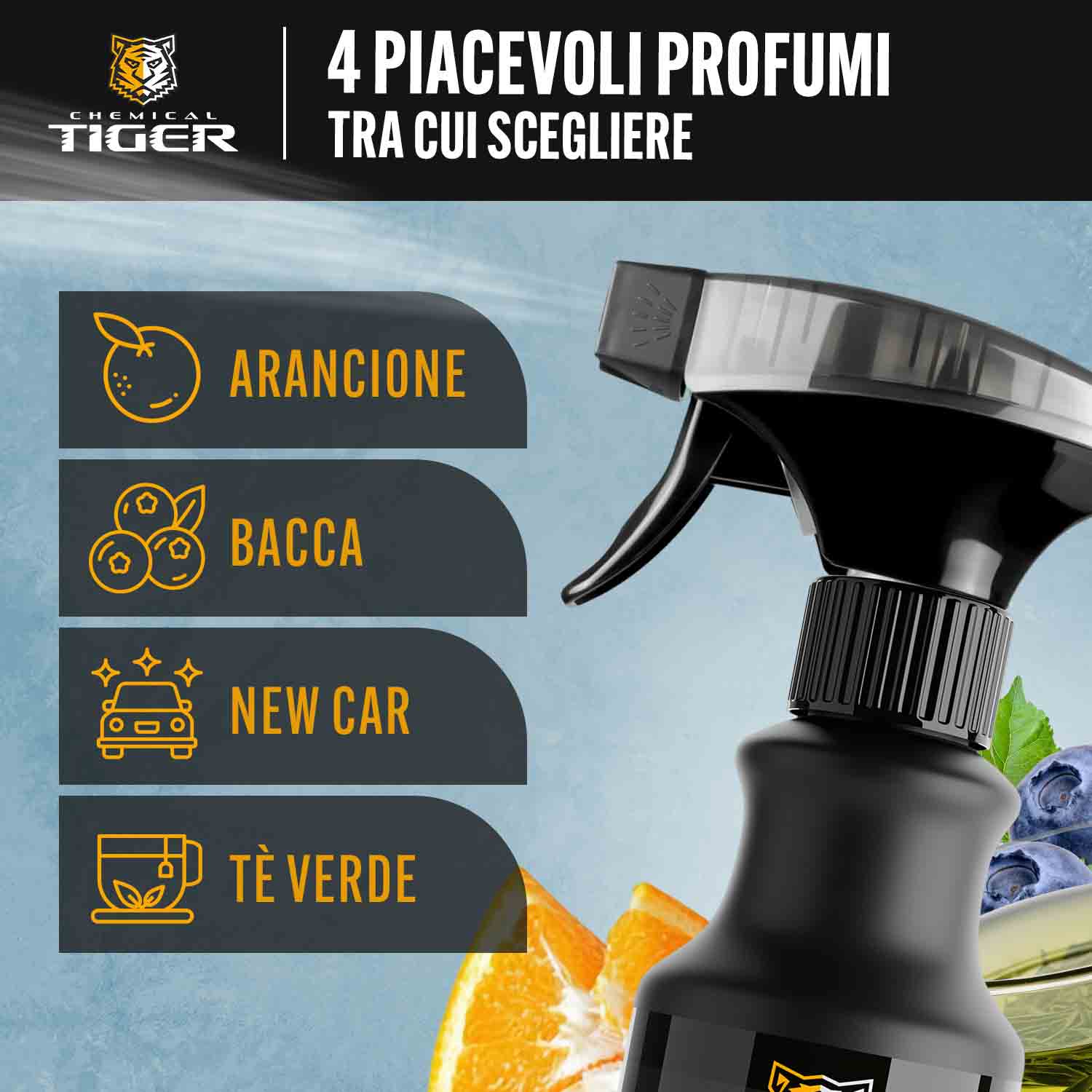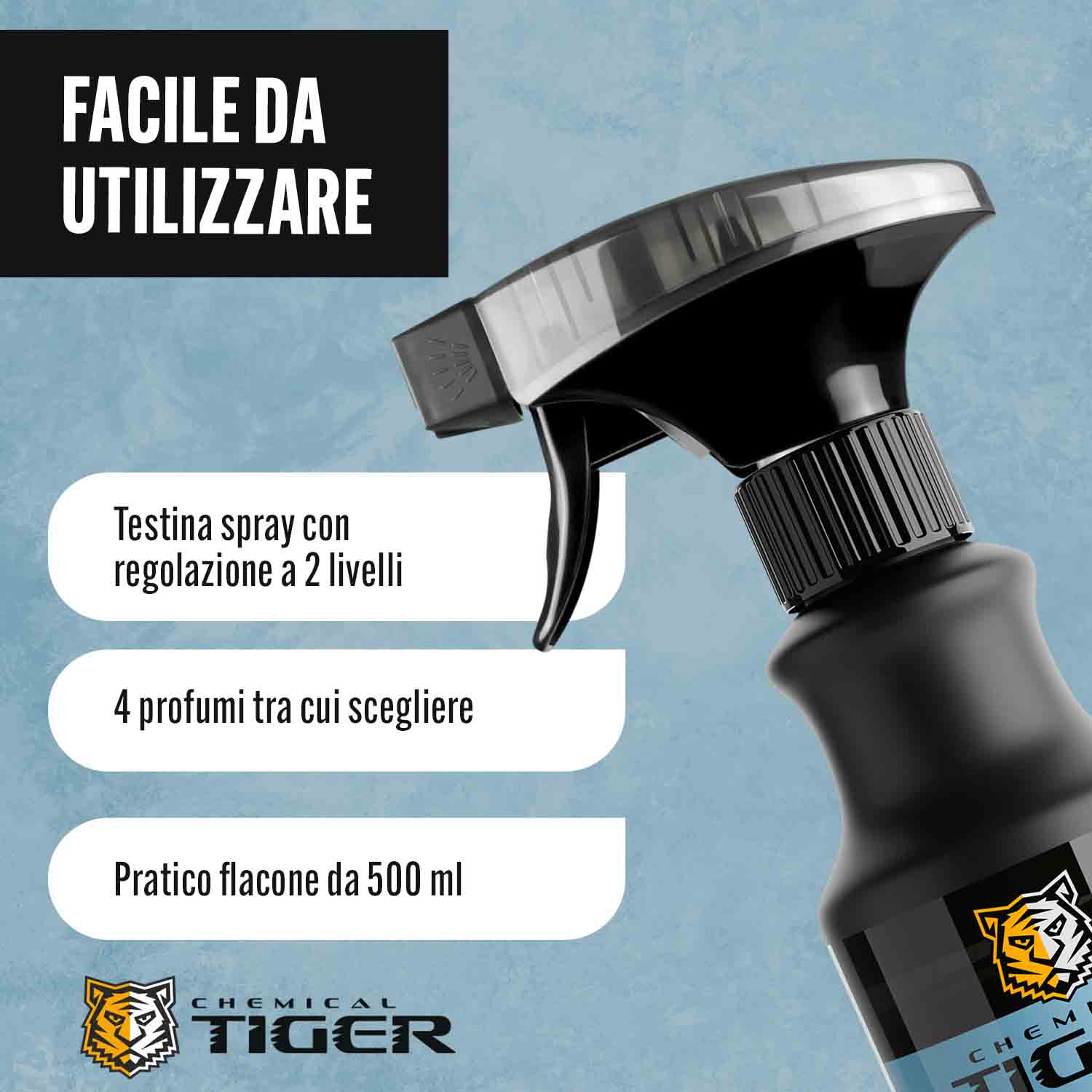 I chimici di Chemical Tiger hanno creato una formulazione proprietaria per questo prodotto con un’ampia gamma di applicazioni, basata su alte concentrazioni di sostanze attive che determinano una performance del prodotto senza pari rispetto agli altri prodotti di questo segmento. La caratteristica distintiva dei prodotti Chemical Tiger è l’azione istantanea del prodotto, con una piacevole fragranza (doppio profumo di tè verde) che rende l’uso del prodotto un puro piacere. Il prodotto è completamente sicuro per l’utilizzatore e per l’auto.