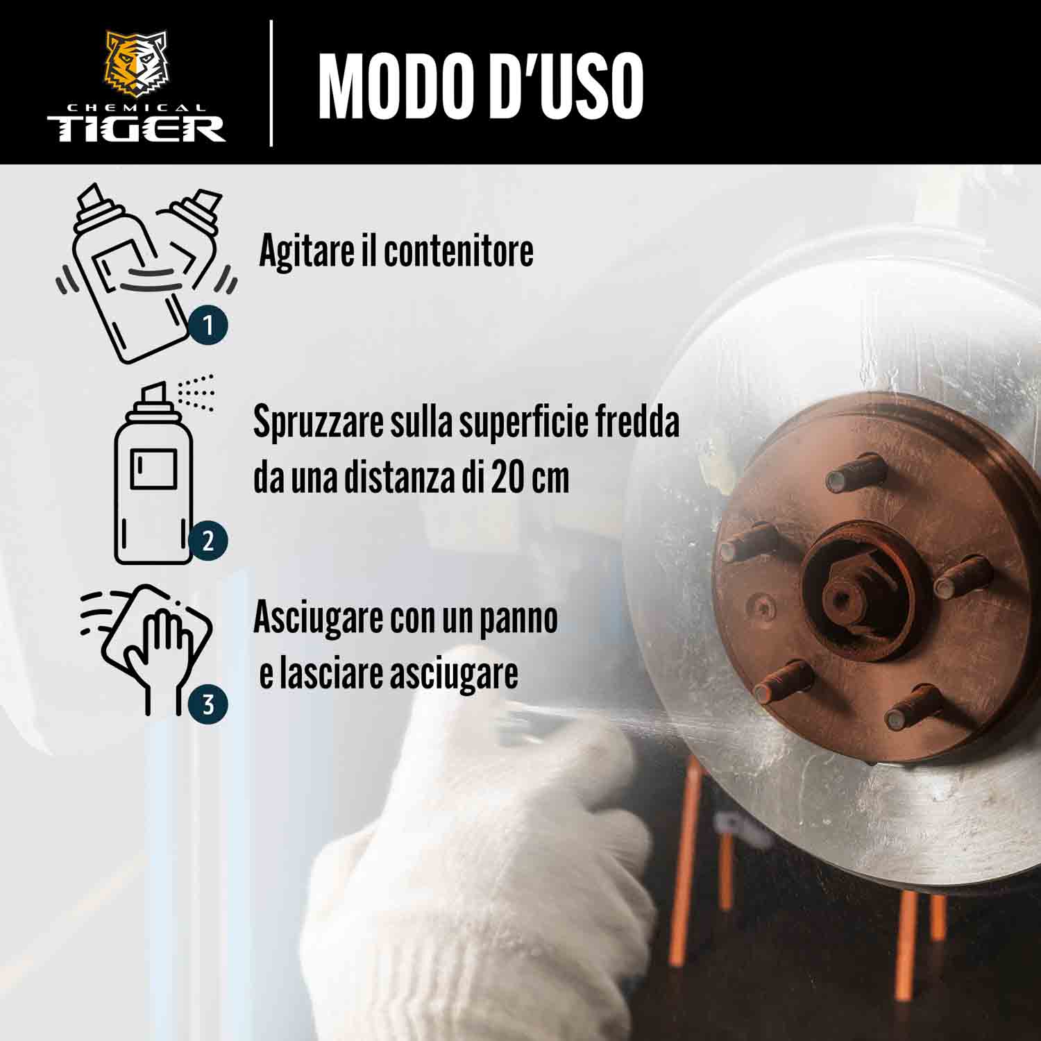 Agitare il contenitore prima dell'uso. Applicare solo su superfici fredde. Spruzzare sulle parti da pulire da una distanza di 10-20 cm. Asciugare con un panno e lasciare asciugare.