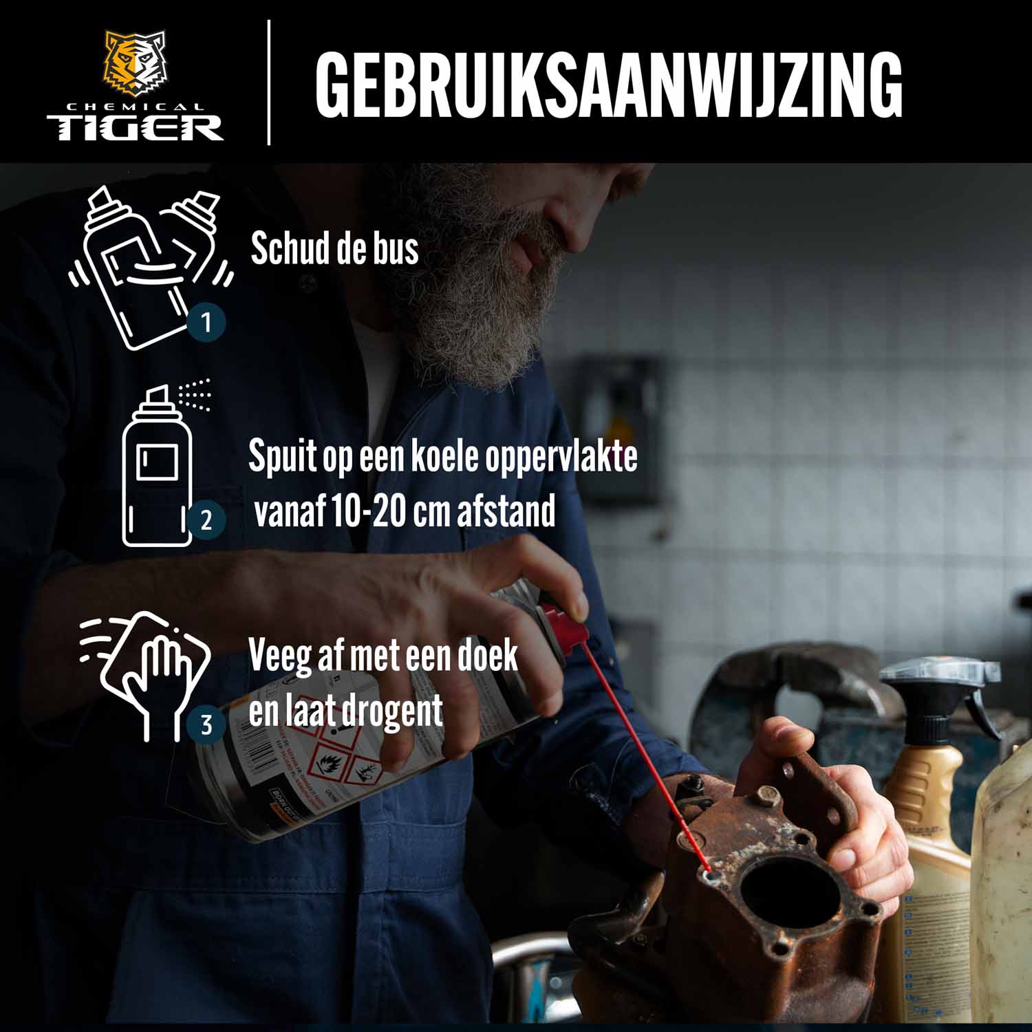 Schudden voor gebruik. Alleen aanbrengen op koude oppervlakken. Spuit op vervuilde oppervlakken van een afstand van 10-20 cm. Afvegen of laten drogen. In het geval van gevoelige materialen: rubber, plastic schuim, textiel, gelakte oppervlakken, test het effect van het product op een onopvallende plaats.