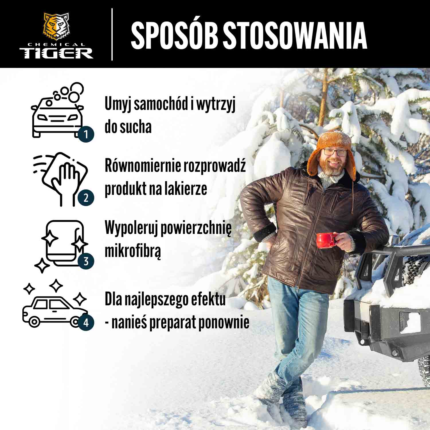 Środek do ochrony lakieru samochodowego przed czynnikami atmosferycznymi i środowiskowymi generowanymi głównie w okresie jesienno-zimowym. Chroni lakier przed solą drogową, opóźnia proces brudzenia się lakieru oraz tworzy na jego powierzchni śliską osłonę hydrofobową. Dodatkowo gwarantuje zwiększenie połysku lakieru. Innowacyjny preparat siloksanowy błyskawicznie wiąże się z powierzchnią lakieru, dzięki czemu produkt jest łatwy w użyciu, a efekt jego działania jest natychmiastowy. Praca z produktem jest dodatkowo komfortowa ze względu na jego przyjemny zapach.