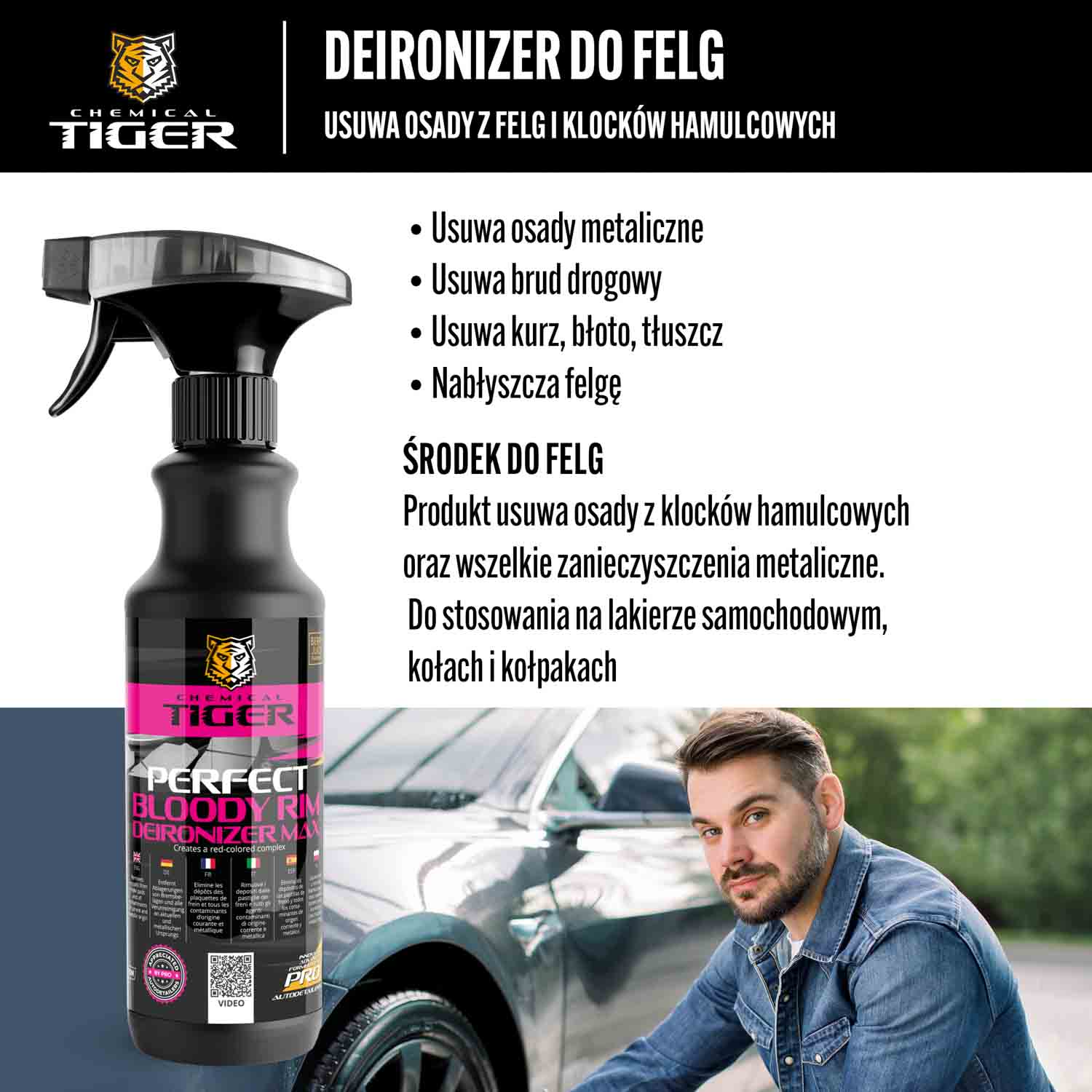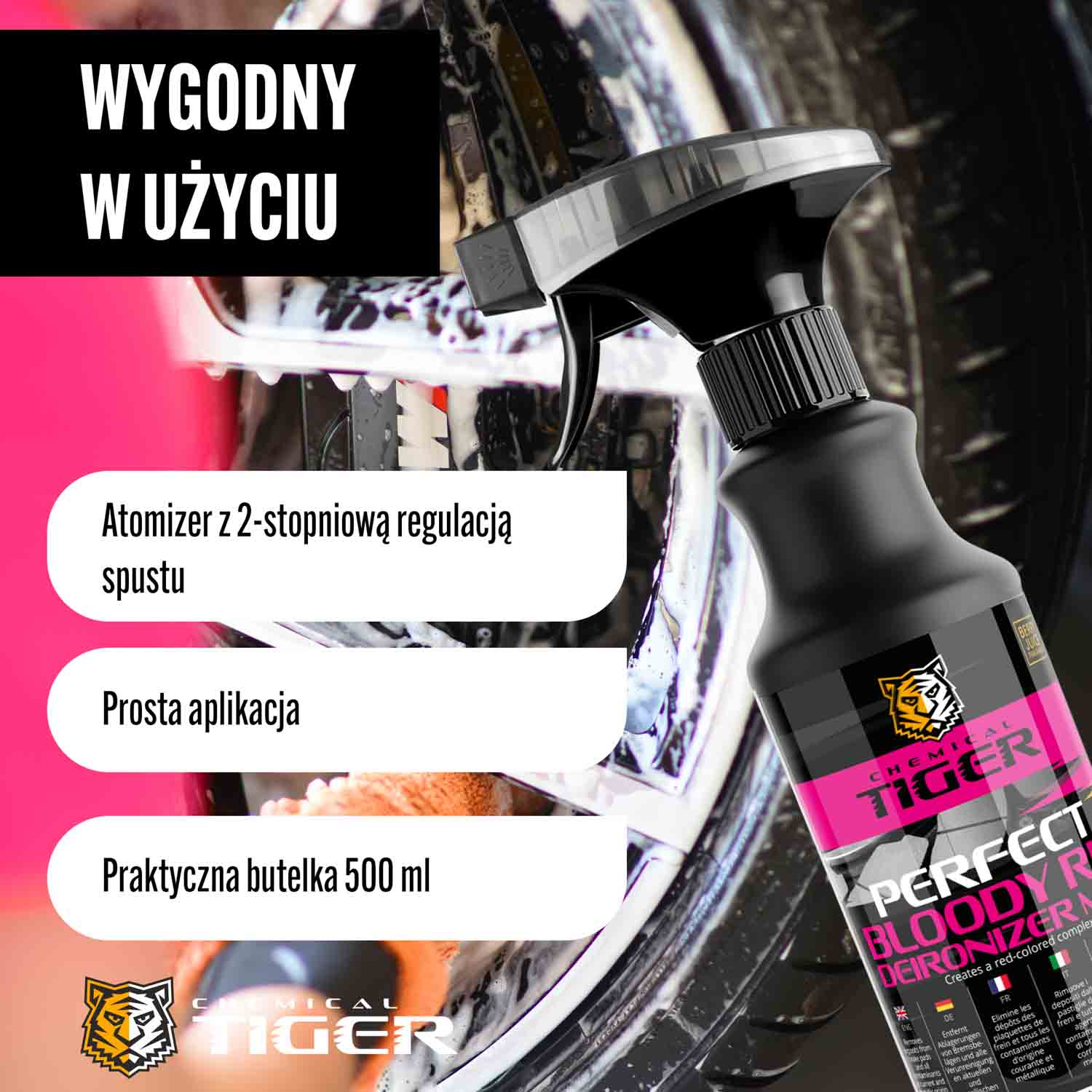 Izdelek odstranjuje obloge z zavornih oblog ter vse tokovne in kovinske nečistoče. Za uporabo na avtomobilskem laku, platiščih in pokrovih. Izdelek vsebuje kompleksno sredstvo, ki se ob reakciji s kovinskimi nečistočami obarva rdeče. Reakcija tako omogoča nadzor nad postopkom čiščenja. Poleg kompleksirajočega sredstva je izdelek obogaten z močnimi detergenti, tako da se med uporabo odstranijo vse vrste trenutne umazanije. pH izdelka je nevtralen, zato je varen za vse zunanje površine avtomobila. V neprijetnem vonju kompleksnega sredstva, ki je značilen za to vrsto izdelka, prevladuje vonj po jagodičevju.