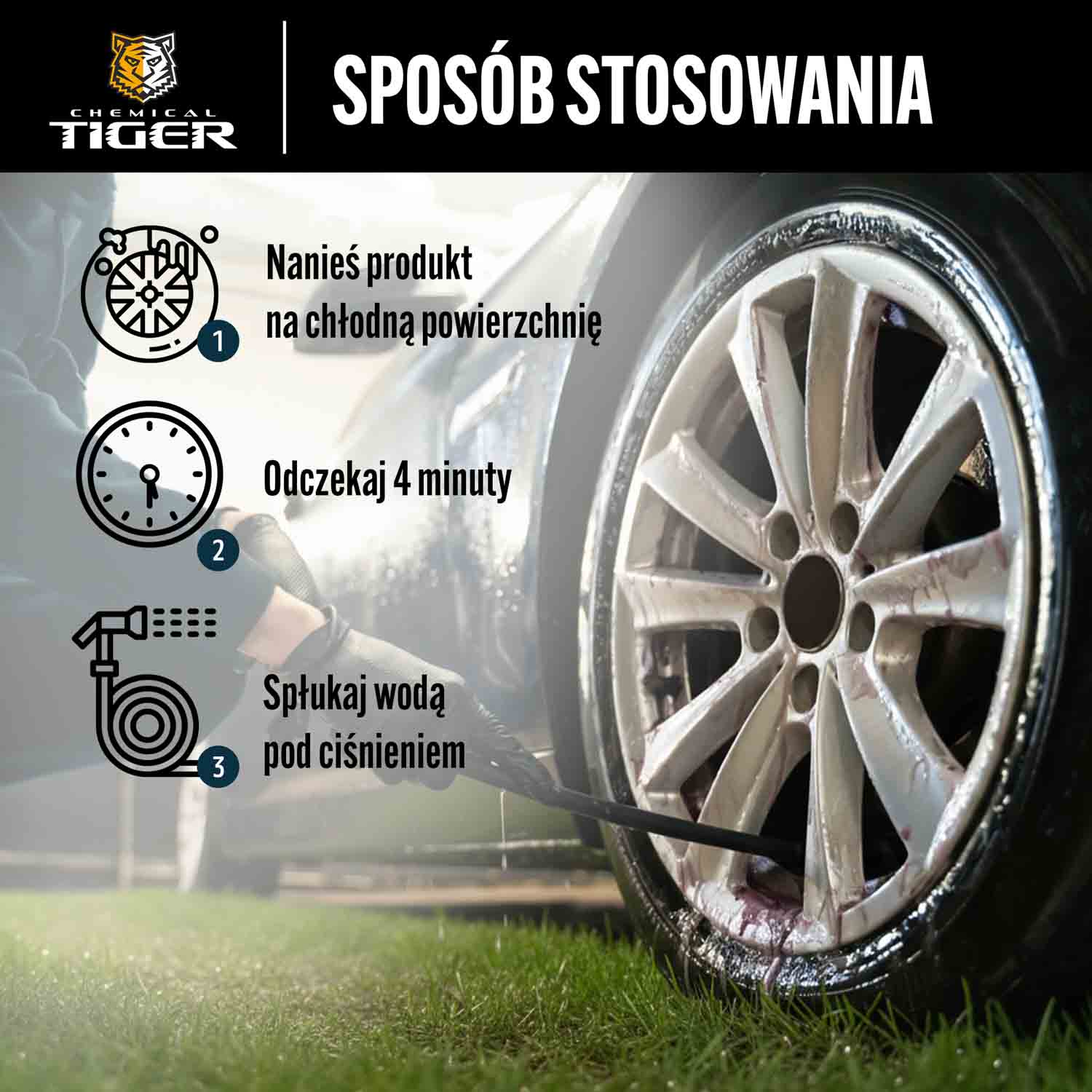 Izdelek nanesite na onesnaženo, hladno površino. Počakajte 2-4 minute, to je povprečni reakcijski čas izdelka. Temeljito sperite z vodo pod pritiskom. V primeru zelo trdovratne umazanije po nanosu izdelka izdelek razmažite s čopičem, gobo ali krtačo. OPOMBE O UPORABI: Izdelek nanesite na hladno površino. Izdelek uporabljajte v senci. Ne dovolite, da izdelek zamrzne. Ne dovolite, da se naneseni izdelek izsuši.