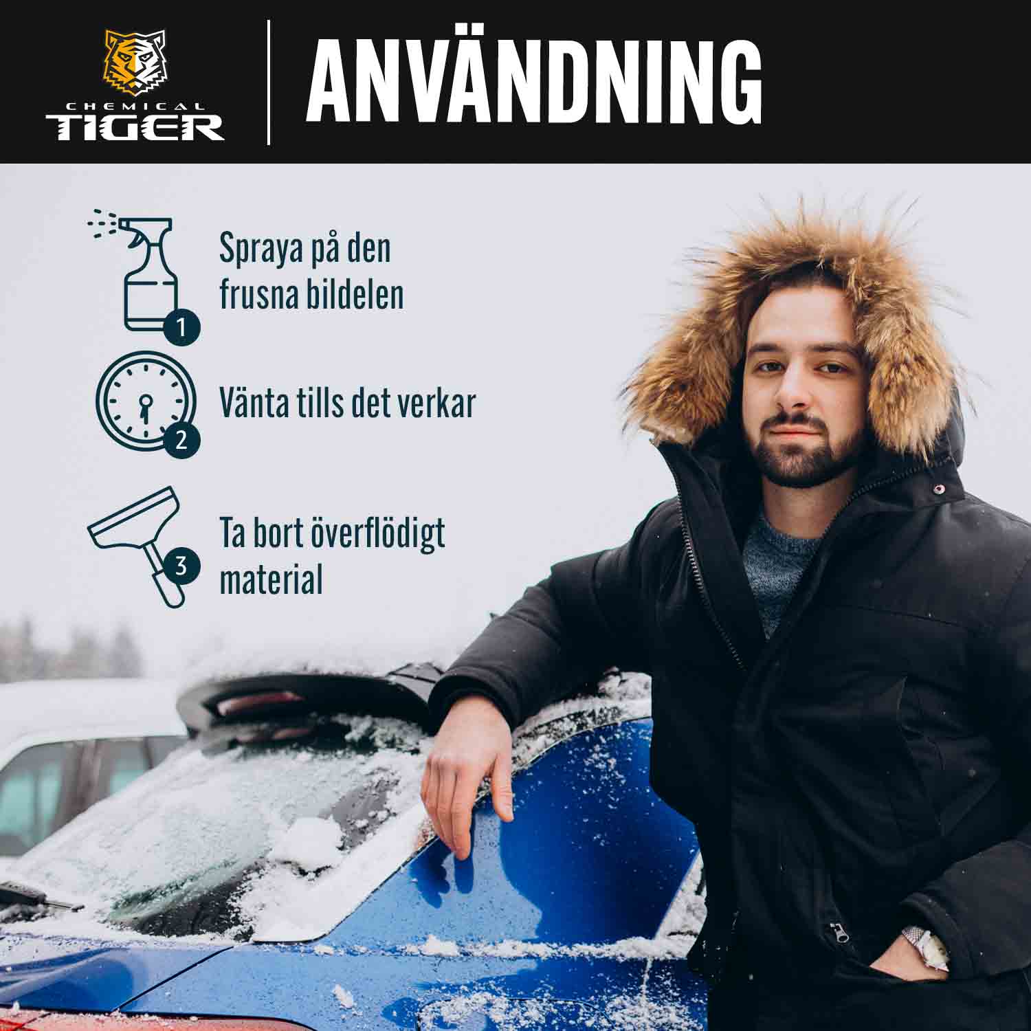 Applicera produkten direkt på det frysta glaset. Vänta tills produkten synbart har verkat. Ta bort överflödig produkt med en mikrofiber eller skrapa.