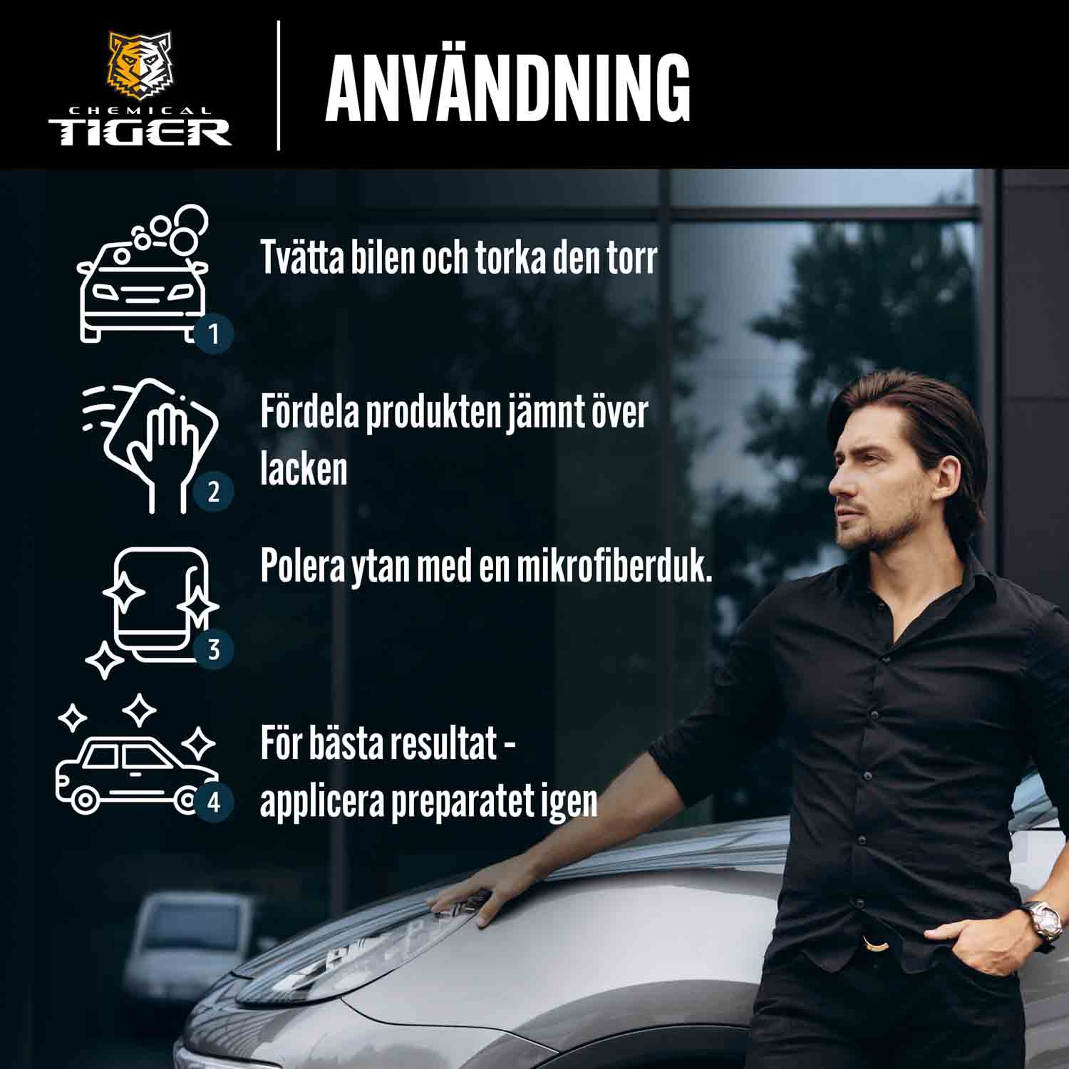 • gör lacken hal: Ytan blir slät och motståndskraftig mot smuts, vilket gör det lättare att hålla bilen ren