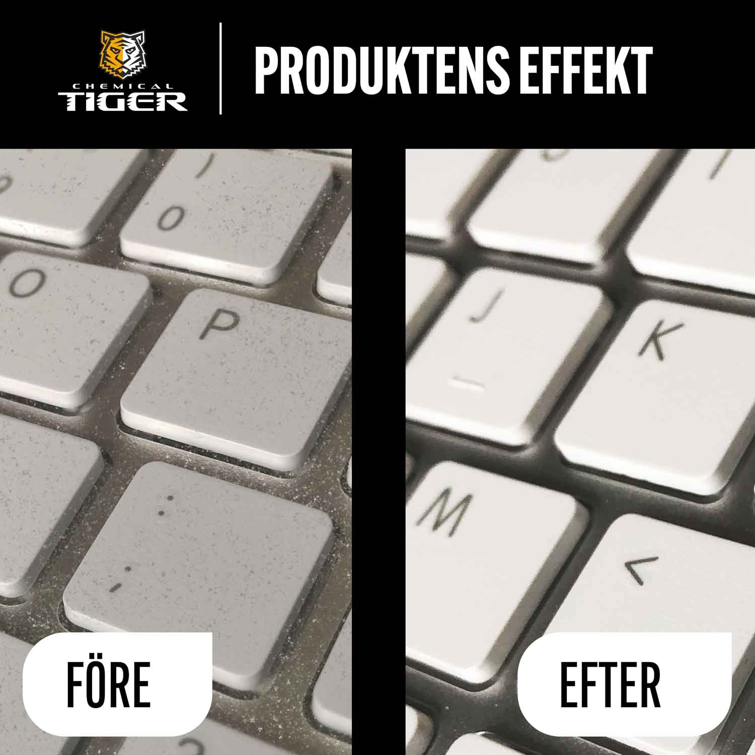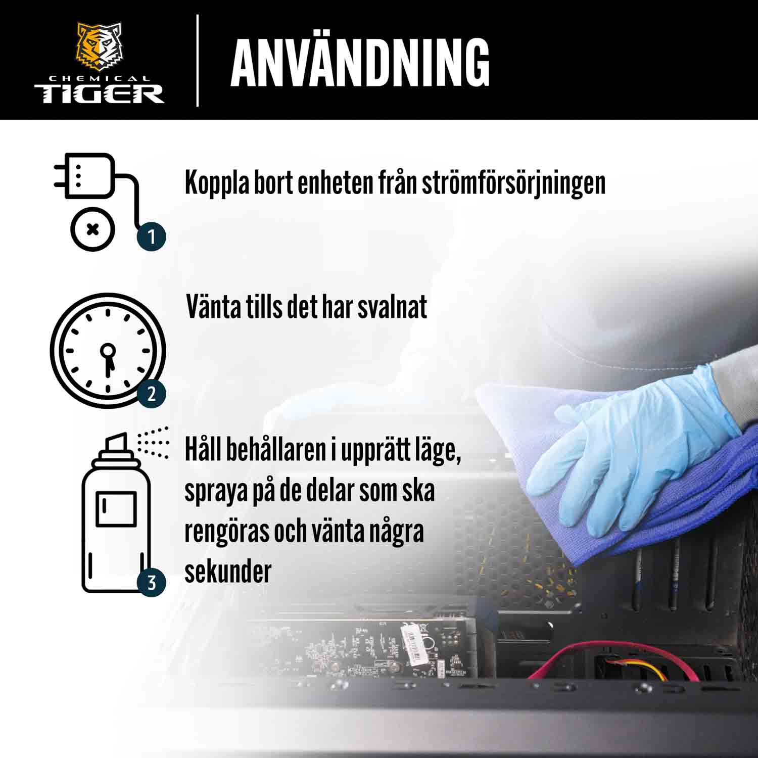 Stäng av den enhet som ska rengöras och koppla bort den från strömförsörjningen. Låt den svalna. Håll behållaren upprätt och spraya på de delar som ska rengöras och vänta några sekunder.