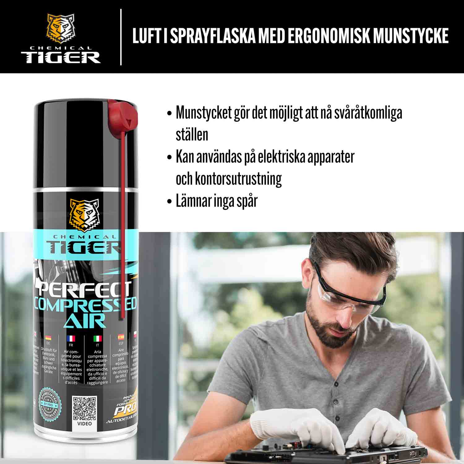 Tryckluft för rengöring av kontorsutrustning och andra elektriska apparater. Under högt tryck avlägsnar den smuts från svåråtkomliga områden utan att lämna några rester.